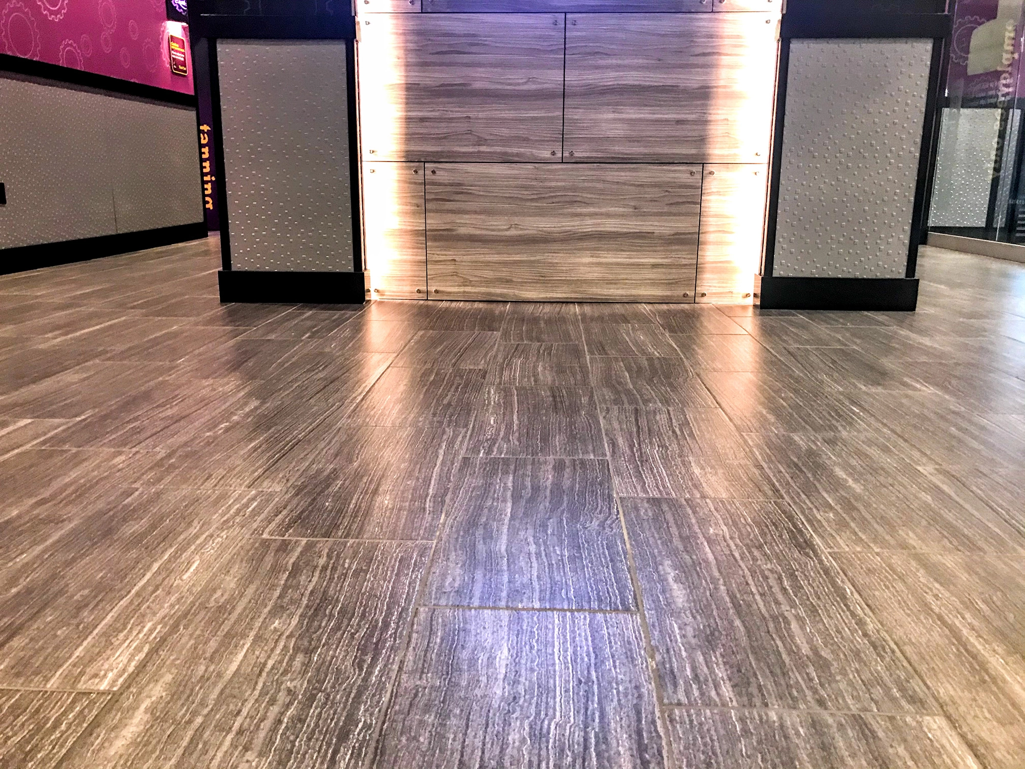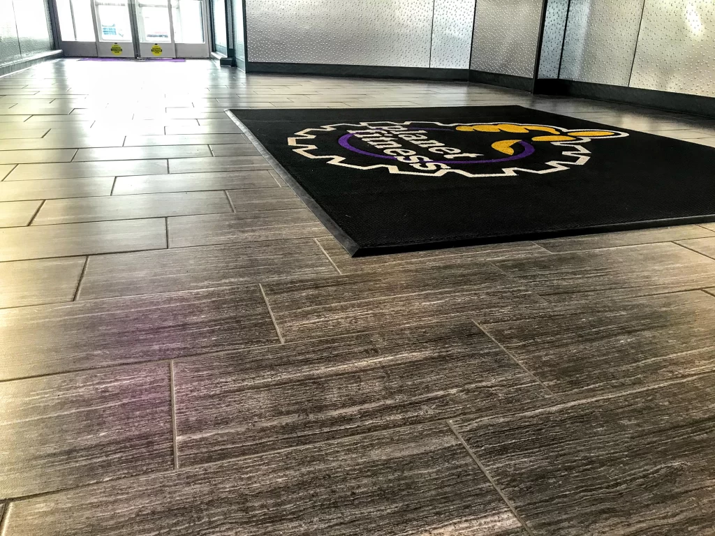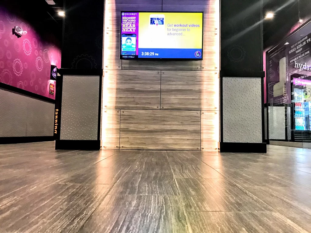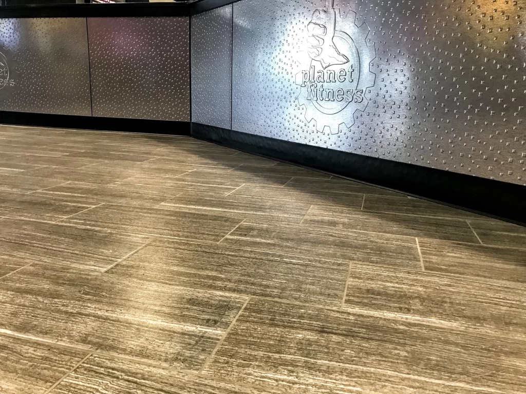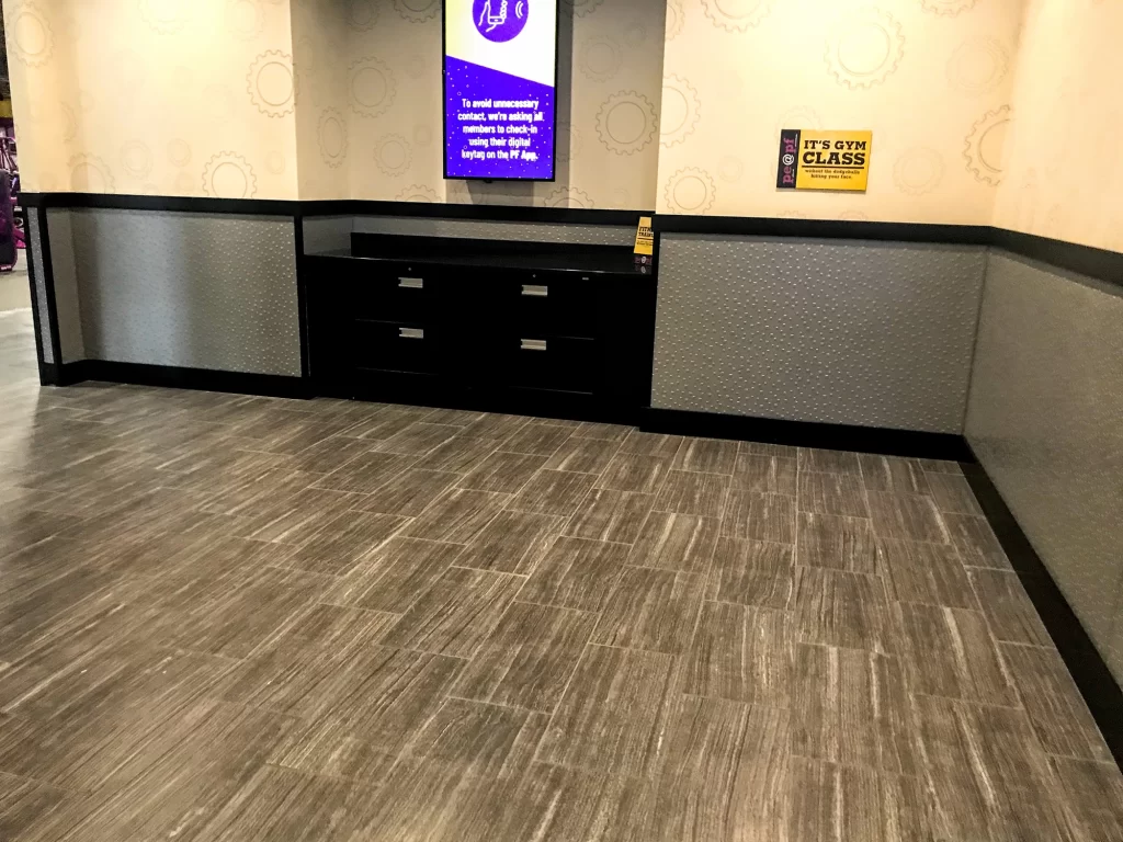 Fischer Flooring installed a variety of tiles, including ceramic tiles throughout this Planet Fitness on the floors and walls.