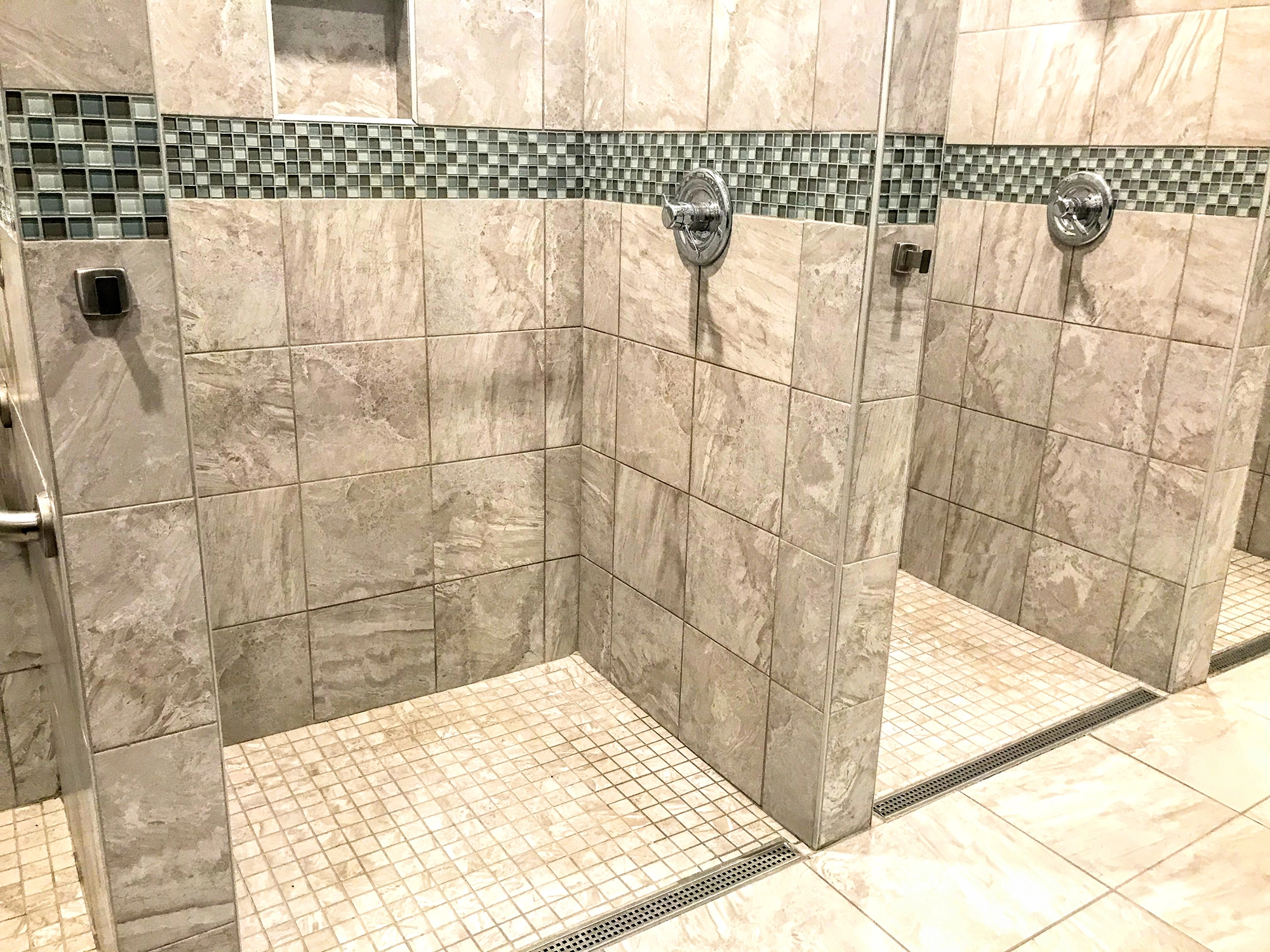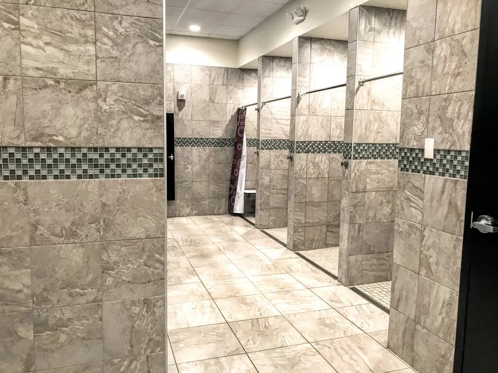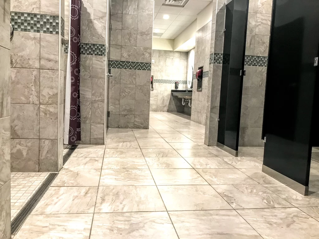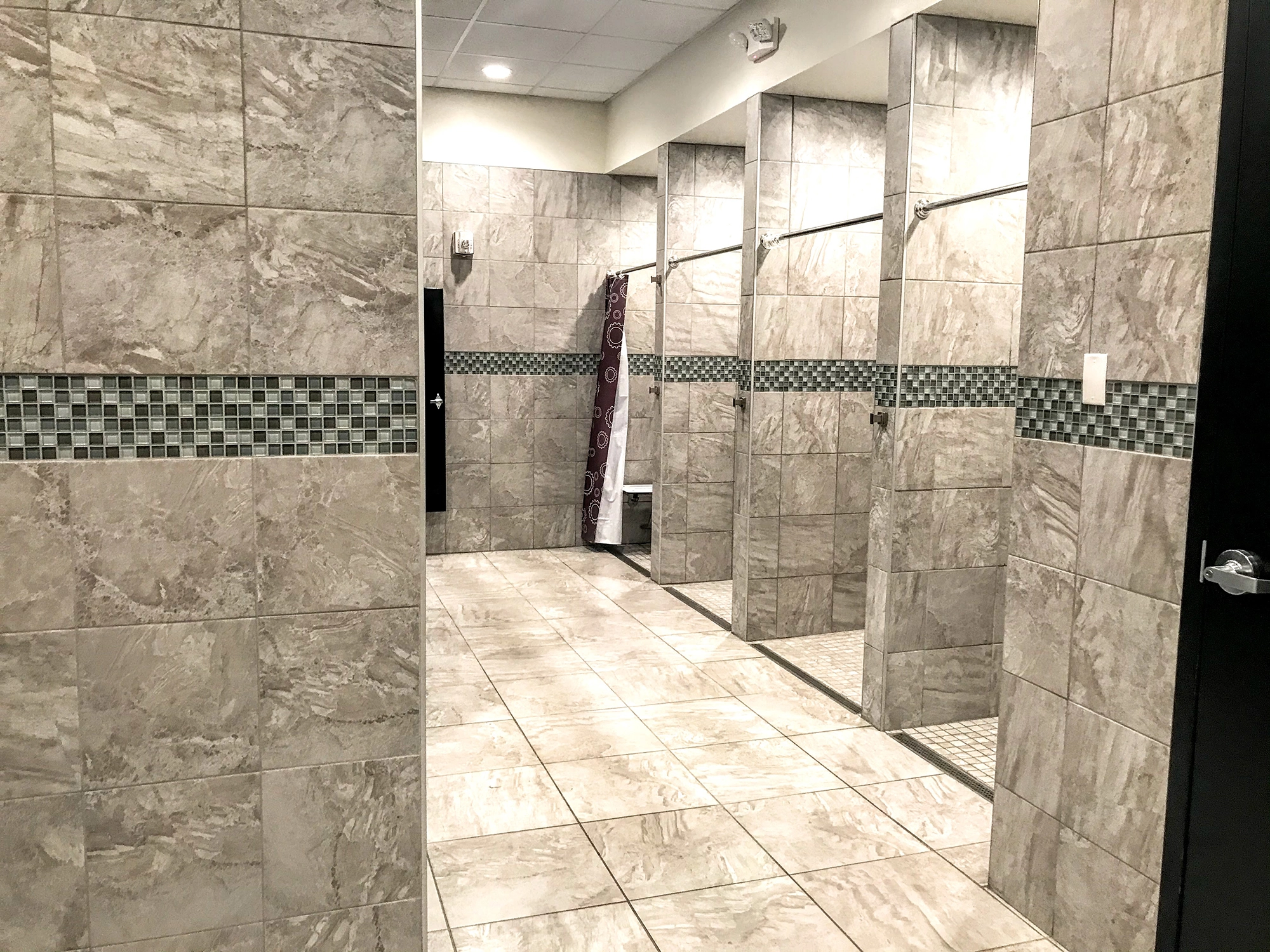 Fischer Flooring installed a variety of tiles, including ceramic tiles throughout this Planet Fitness on the floors and walls.